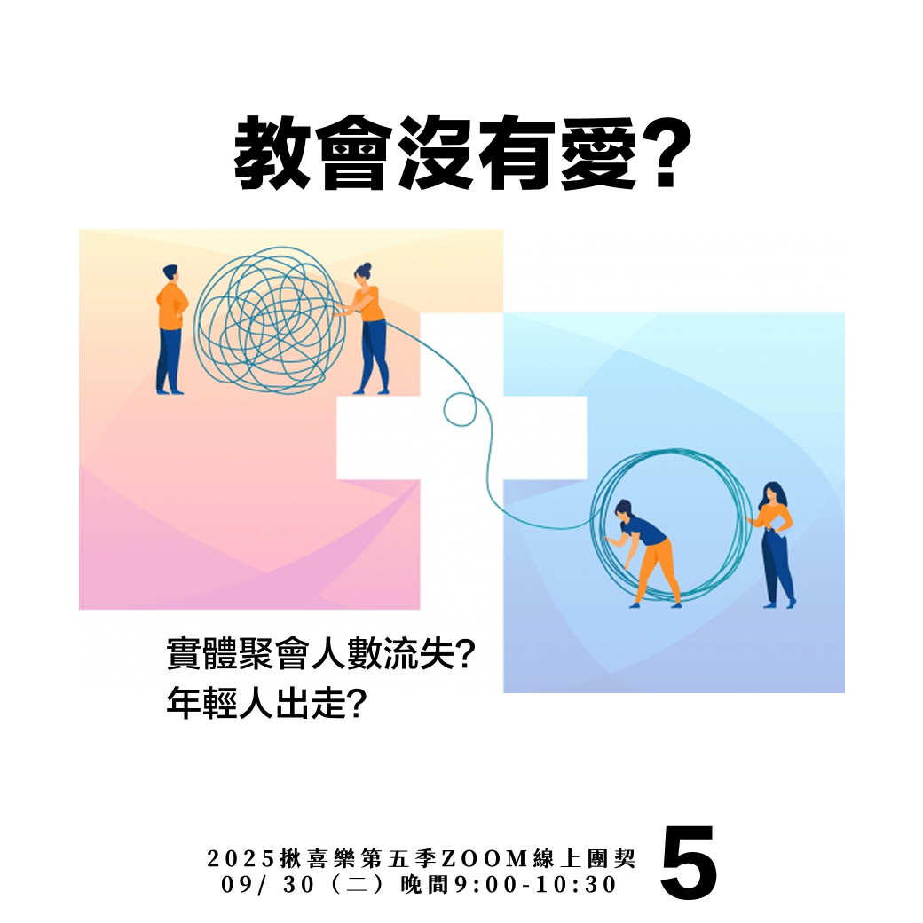 每週二晚間 9:00-10:30 線上團契歡迎所有人線上參與分享、旁聽